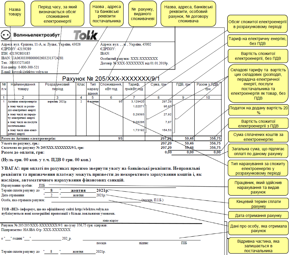 Роз'яснення рахунку за електричну енергію з поясненням кожного елементу рахунку